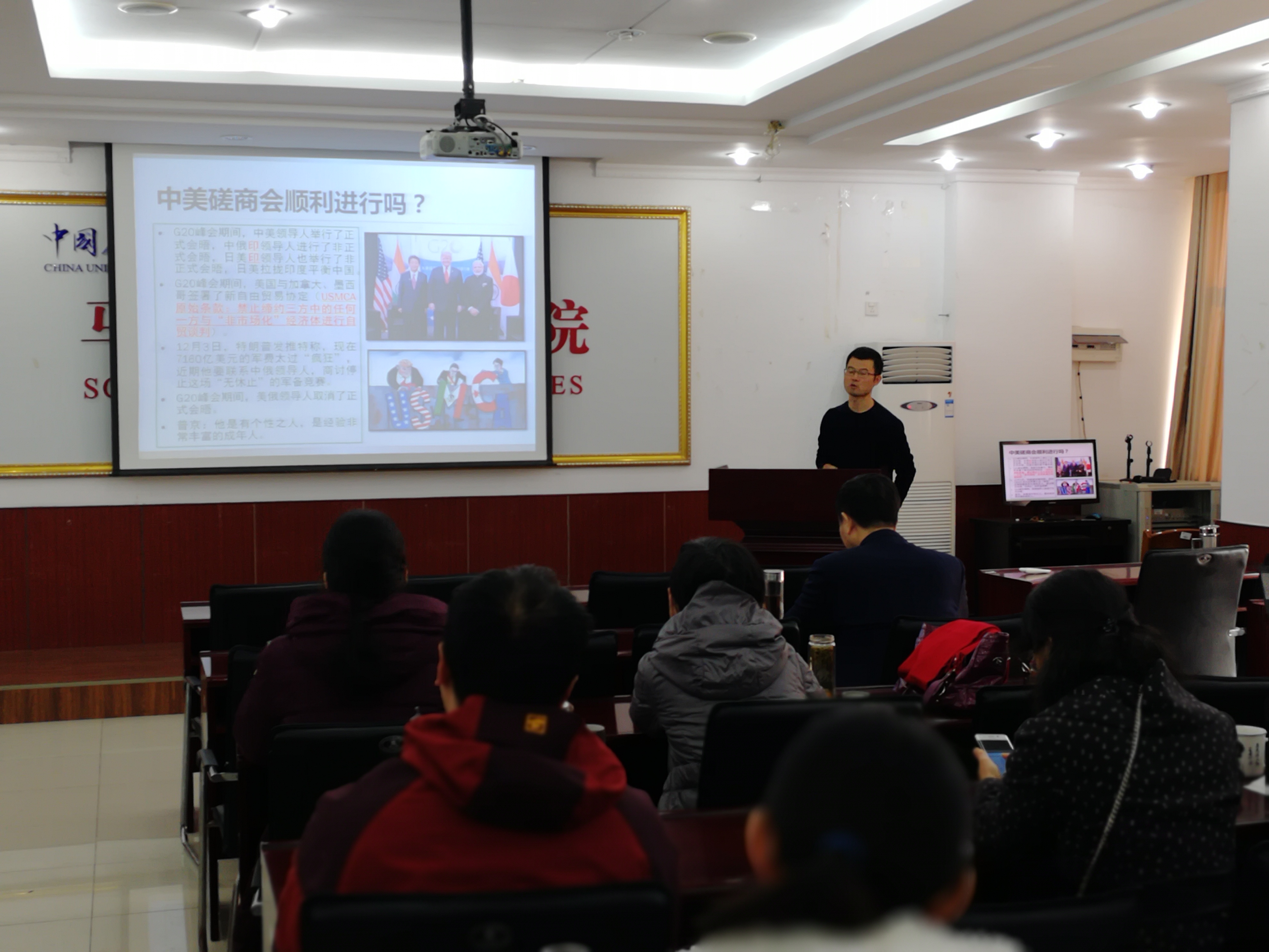 12月13日上午8:30分,概论党支部在文理楼457举行主题党日活动,活动由郎帅老师为大家做关于“中美经贸摩擦与中美关系的未来”的报告,学院各党支部的党员老师和学生党员参加了报告会。郎帅老师在报告中首先指出了经贸关系在中美关系中的重要性,随后结合当今的热点问题谈了中美经贸磋商的重要性和积极意义,最后指出在未来的中美关系发展中两国应该以合作取代对抗,实现共赢。郎帅老师引经据典,通过大量的数据和案例给我们奉献了一场精彩的报告,为理解当下的中美关系提供了新的思路。