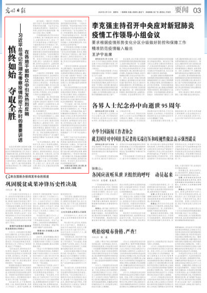 光明日报3月13日第3版《慎终如始 夺取全胜——习近平总书记在湖北考察疫情防控工作时的重要讲话在各地干部群众中引发热烈反响》一文中,永利y23455副院长张瑞涛教授说“总书记视察武汉,看望一线医护人员、社区工作者和志愿者,令人备受鼓舞、倍感振奋。武汉必胜、湖北必胜、中国必胜,这正是社会主义制度优势的最好诠释。战疫凝聚了中华儿女团结奉献、同心同德的力量,我们当再接再厉,以爱人之仁、担当之勇、创新之智、躬行之实,打赢这场没有硝烟的战斗。”