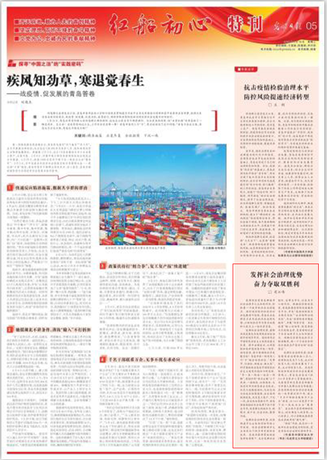 光明日报3月18日第5版刊登了永利y23455党委书记司江伟教授的文章《发挥社会治理优势 奋力夺取双胜利》。文章从发挥社会治理优势,最根本的是要充分发挥党在社会治理中的领导作用,要构建多元主体协同协作的工作机制,要坚持社会治理的核心在人三个方面,阐述了面对疫情防控和经济社会发展两个战场,青岛充分发挥其正在形成的社会治理优势,以新的担当作为努力向党和人民交上一份优异答卷。