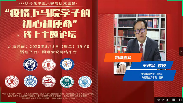 学院院长王建军教授为论坛致辞,号召全国各高校马院学子们在疫情下要加强理论反思,坚定“四个自信”。
