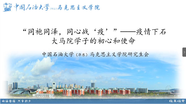 论坛共分为四个环节。在分享环节中,八所高校的永利y23455研究生会负责人以PPT的形式图文并茂地分享了疫情期间的战“疫”经验、典型做法和涌现的榜样人物。四川大学永利y23455研究生会以“基层宣讲,以‘智’战‘疫’”为题,聚焦“博士生云端宣讲”;电子科技大学永利y23455研究生会以“同心战‘疫’,多向发力齐攻‘毒’”为题,坚持开展现上人文经典读书会、读书写作“悦享会”、高校交流会和“求实讲坛”;我院研究生会以“同袍同泽,同心战‘疫’:疫情下石大马院学子的初心和使命”为题,立足“知”“心”“歌”“文”“行”的方式投入战“疫”;西安交通大学永利y23455研究生会以“众志成城克时艰:西交马院研究生在奋勇担当中谱写青春”为题,展现了有担当的西交青年形象;重庆大学永利y23455研团委学生会以“抗‘疫’征程,重马在路上”为题,发扬了“爱国家”的精神;山东大学永利y23455研究生会以“青山一道,同担风雨:山大马院研会在行动”为题,筑牢了“有一分热,发一分光”的思想指针;华中师范大学永利y23455研究生会以“同心战‘疫’,共待骄阳”为题,凝聚起团结抗“疫”的强大合力;河海大学永利y23455研究生会以“携手同心抗疫情,共克时艰展担当”为题,通过《抗“疫”特辑》奏响了水利学子的抗“疫”乐章。