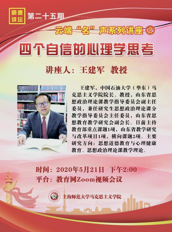 5月21日下午,院长王建军教授应上海师范大学永利y23455的邀请为学院研究生作了题为“四个自信”的心理学思考的线上讲座。