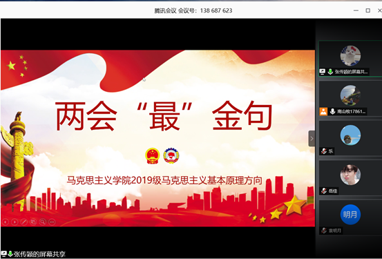 分享会采取线上形式,以各年级专业方向为单位进行分享交流。各专业方向认真搜集、整理并立足本专业对“两会”金句进行了解读。2018级马克思主义基本原理方向小组以“脱贫、农民”、“人民至上、生命至上”两组关键词进行了有关“两会”金句的分享,作为马克思主义原理方向的学生,他们还通过马恩原著的经典语句对所分享的金句进行了解读和阐释。2018级思想政治教育方向小组分享了多个维度的“两会”金句,如防疫、民法典等。2018级高等教育学方向的学生针对2020年政府工作报告中有关教育的修改内容进行了整理,通过整理讨论,总结出了“坚持立德树人”、“高等教育内涵式发展”、“推进教育现代化”、“发展职业教育”等有关高等教育方面的金句。2019级马克思主义中国化方向小组分享了以“人民至上”、“充满信心”两大主题的金句,并指出其中的背景、内涵与意义。2019级中国近现代史方向小组分享了关于疫情防控的金句,传达了疫情防控的常态化政策与精神。