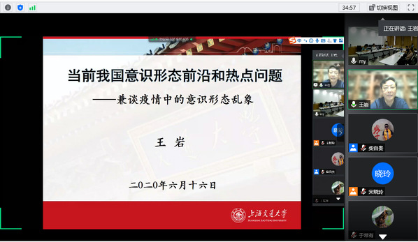 6月16日下午,永利y23455举办“初心讲堂”第二十讲,本次讲座特邀教育部长江学者特聘教授、南京航空航天大学永利y23455博士生导师王岩教授作关于“当前我国意识形态热点与前沿问题——谈疫情中的意识形态”的学术报告。本次报告以腾讯会议形式举办,并在文理楼457设立主会场,永利y23455院长王建军教授主持,永利y23455全体师生、学校部分辅导员及机关干部等共同聆听了此次报告。