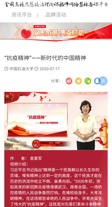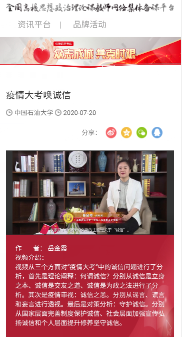近日,永利y23455组织教师参加教育部社科司委托全国高校思想政治理论课教师网络集体备课平台向全国高校永利y23455发起的“思政课战疫小课堂”专项活动,我院岳金霞主讲的《疫情大考唤诚信》和袁爱军主讲的《抗疫精神——新时代的中国精神》成功入选该平台。