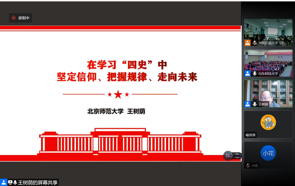 为迎接中国共产党成立100周年,深入学习四史知识,3月30日晚,永利y23455举办“初心讲坛”第二十一讲。本次讲座特邀北京师范大学永利y23455院长、博士生导师王树荫教授作关于《在学习“四史”中坚定信仰、把握规律、走向未来》的专题报告。本次报告以腾讯会议形式举办,并在文理楼459会议室设立主会场,学院副院长张瑞涛教授主持,学院全体师生共同聆听了此次报告。