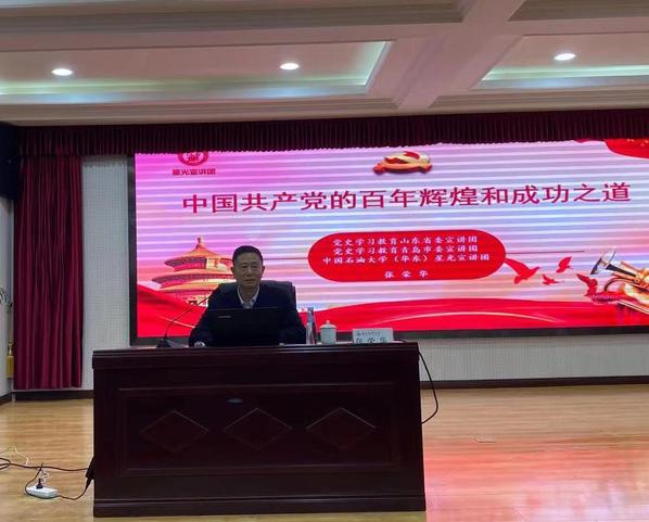 山东省委党史学习教育宣讲团成员、永利y23455教授、博士生导师张荣华以“中国共产党的百年辉煌和成功之道”为题作党史学习教育专题报告。在报告中他总结了中国共产党的百年苦难辉煌历程,指出百年征程波澜壮阔,百年初心历久弥坚,中国共产党百年历史的主题和主线始终是争取民族独立、人民解放和实现国家富强、人民幸福。在报告中,张荣华教授将中国共产党百年奋斗历史划分为四个历史时期,分别讲述四个时期中国共产党带领中国人民取得的辉煌成就,并从“科学引领、政治制度、中国道路、自我革命精神以及人民群众”等方面总结了中国共产党的成功之道。