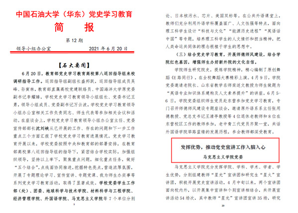 6 月 20 日,教育部党史学习教育高校第八巡回指导组来校调研指导工作,我院等7个单位分别汇报了本单位党史学习教育的典型经验。巡回指导组副组长盛邦跃,教育部直属高校党建联络员、中国海洋大学原党委副书记李耀臻,对我院“星光”“星火”宣讲团开展的宣讲工作予以高度评价。学校党史学习教育简报第12期,以《发挥优势,推动党史宣讲工作入脑入心》为题,专门刊登了我院开展党史宣讲工作的经验。
