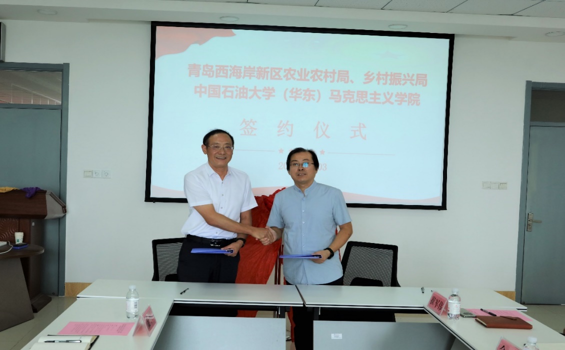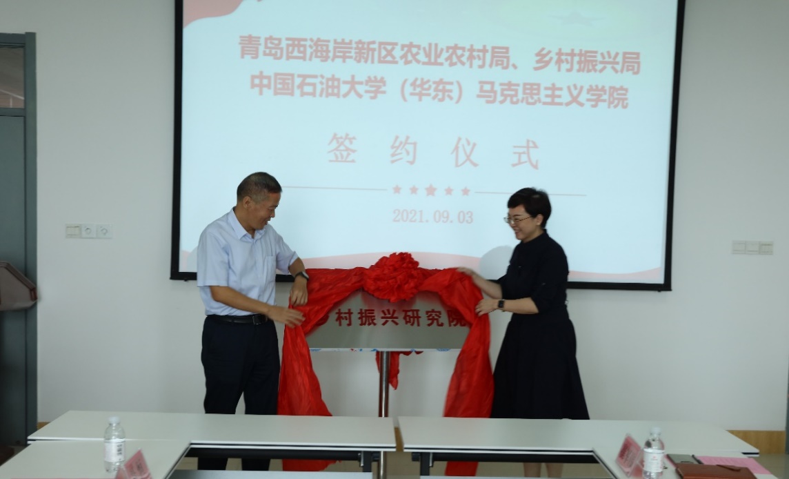 随后,张瑞涛院长与青岛西海岸新区农业农村局、乡村振兴局局长王卫青签署合作协议;我校文科建设处副处长金玉洁与青岛西海岸新区分管领导刘记军代表双方为“乡村振兴研究院”揭牌。