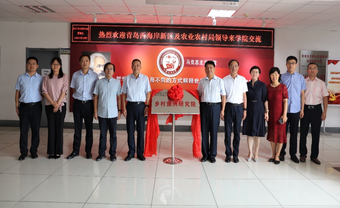 在全面建设社会主义现代化国家,全力推进乡村振兴战略之际,9月3日上午,我院与青岛西海岸新区农业农村局、乡村振兴局举行了合作协议签字仪式暨合作共建乡村振兴研究院揭牌仪式。青岛西海岸新区领导刘记军,农业农村局、乡村振兴局领导王卫青、范瑞非、聂恒,我校文科建设处领导金玉洁,我院领导张瑞涛、司江伟、宋海儆、崔军伟、袁爱军等出席仪式。