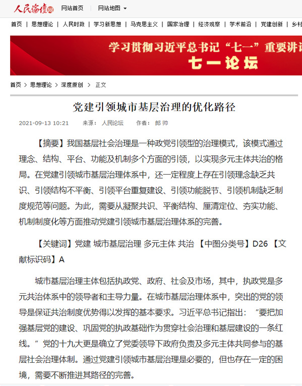 近日,《人民论坛》2021年9月上期(总第716期)刊发了我院郎帅老师的党史党建研究文章《党建引领城市基层治理的优化路径》。文章认为,党的十九大确立了党委领导下政府负责及多元主体共同参与的基层社会治理体制。通过党建引领城市基层治理是必要的,但也存在一定的困境,需要不断推进其路径的完善。文章指出,我国基层社会治理是一种政党引领型的治理模式,该模式通过理念、结构、平台、功能及机制多个方面的引领,以实现多元主体共治的格局。在党建引领城市基层治理体系中,还一定程度上存在引领理念缺乏共识、引领结构不平衡、引领平台重复建设、引领功能脱节、引领机制缺乏制度规范等问题。为此,需要从凝聚共识、平衡结构、厘清定位、夯实功能、机制制度化等方面推动党建引领城市基层治理体系的完善。