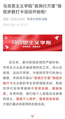 在全员封闭管理的情况下,为保证学生的身体健康,我院研究生会积极筹办体育活动,开展了以“良驹行万里”微信步数打卡为主题的学生体育锻炼活动,帮助同学们在体育锻炼中享受乐趣,增强体质。