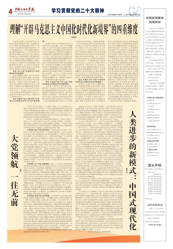 1029日,《中国石油大学报》第15期第4版整版刊发了我院教师阐释党的二十大精神的3篇理论文章。