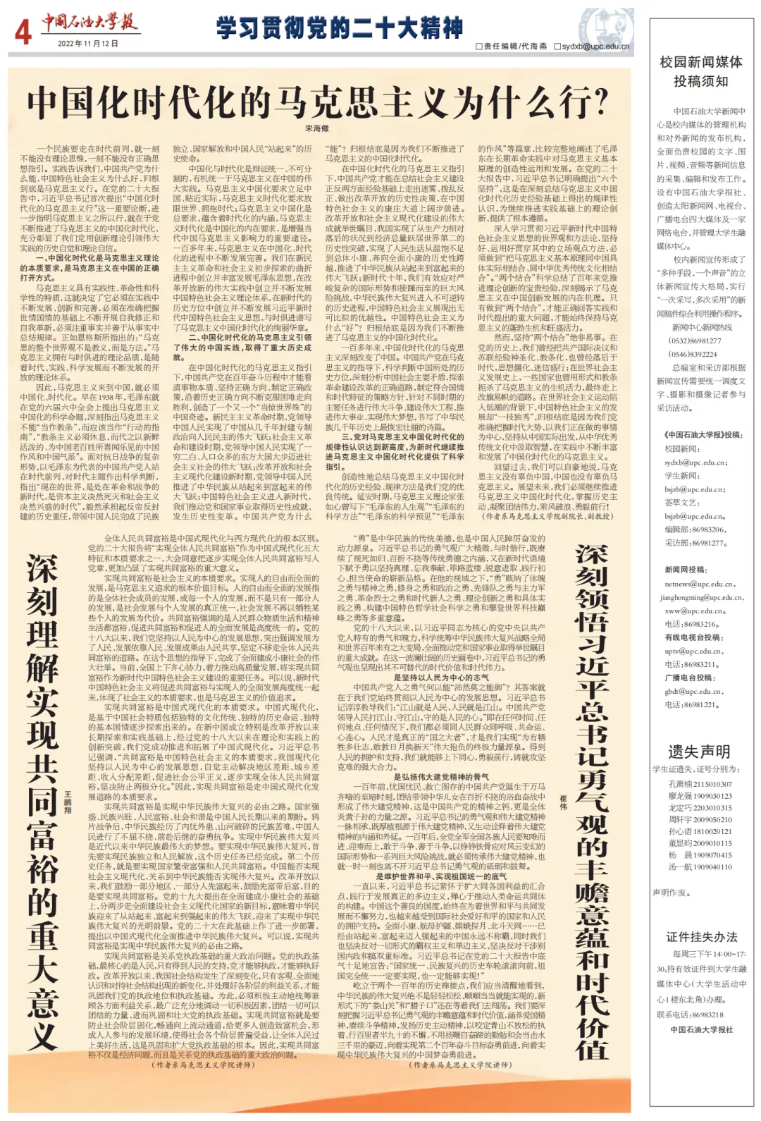 11月12日,《中国石油大学报》第16期第4版整版刊发了我院教师撰写的3篇阐释党的二十大精神的理论文章。