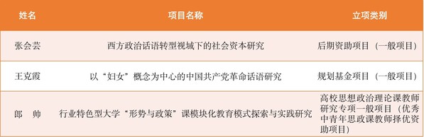 2022年,我院获批3项教育部人文社科规划研究项目。其中,张会芸副教授主持的《西方政治话语转型视域下的社会资本研究》获批后期资助(一般项目),这是我院教师首次获批后期资助项目。王克霞副教授主持的《以“妇女”概念为中心的中国共产党革命话语研究》获批规划基金项目(一般项目),郎帅副教授主持的《行业特色型大学“形势与政策”课模块化教育模式探索与实践研究》获批高校思想政治理论课教师研究专项一般项目(优秀中青年思政课教师择优资助项目)。
