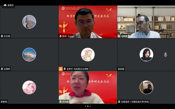 2022年12月25日,马克思主义中国化研究方向“跨学科语境下的青年研究者与谈”系列学术沙龙第五期在线上举行,本期活动以“跨越”为主题,邀请到的与谈人为山东师范大学永利y23455马德坤教授,对话学生为博士生任岚峰、刘红,硕士生王蒋龙舟、王文丽、于洋。此次活动由教师王庆忠与硕士生王舒宁共同主持,分为两个环节,第一个环节马老师分享了关于“跨越”的心得体悟(30分钟),第二个环节马老师与同学们进行对话交流(1小时)。我院教师潘娜娜、郎帅与部分研究生参加了本次活动。