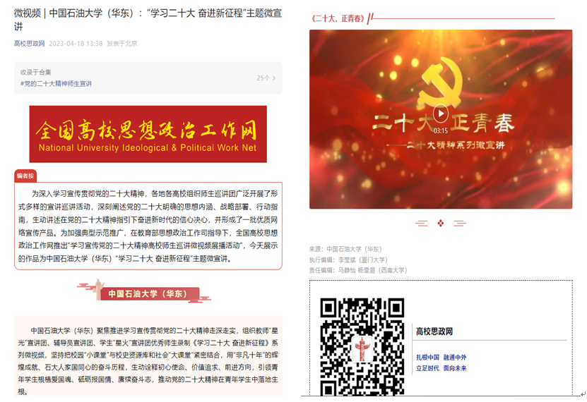 全国高校思想政治工作网指出,yl23455永利集团聚焦推进学习宣传贯彻党的二十大精神走深走实,组织教师“星光”宣讲团、辅导员宣讲团、学生“星火”宣讲团优秀师生录制《学习二十大 奋进新征程》系列微视频,坚持把校园“小课堂”与校史资源库和社会“大课堂”紧密结合,用“非凡十年”的辉煌成就、石大人家国同心的奋斗历程,生动诠释初心使命、价值追求、前进方向,引领青年学生根植爱国魂、砥砺报国情、赓续奋斗志,推动党的二十大精神在青年学生中落地生根。