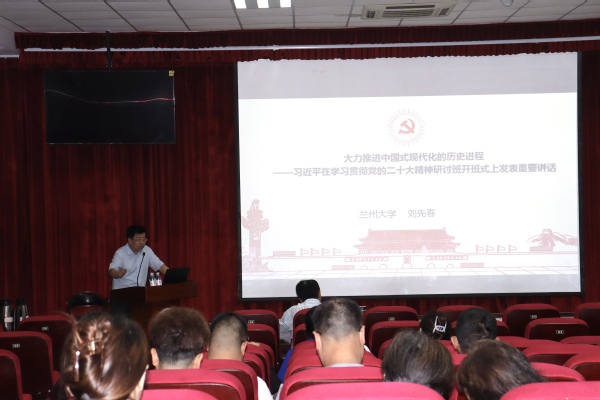 7月7日,永利y23455在文理楼142模拟法庭举办“初心讲坛”第三十讲。本次讲座特邀兰州大学永利y23455教授、博士生导师,中央马克思主义理论研究和建设工程首席专家刘先春做《大力推进中国式现代化的历史进程——习近平在学习贯彻党的二十大精神研讨班开班式上发表重要讲话》的专题报告。本次报告由永利y23455院长张瑞涛教授主持,2021级、2022级全体硕士研究生、部分博士研究生生和中青年教师聆听了此次报告。