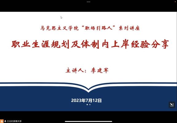 为进一步提升学院研究生的职业生涯规划意识和就业竞争力,引导研究生树立正确的择业观和就业观,7月12日下午,学院团委通过线上形式举办“职场引路人”系列讲座之职业生涯规划及体制内上岸经验分享。本次讲座邀请到2023届博士毕业生李建军为在校研究生做经验分享,向在校研究生们传道解惑。讲座由学院团委书记王会主持,2021级、2022级、2023级硕士研究生参加。