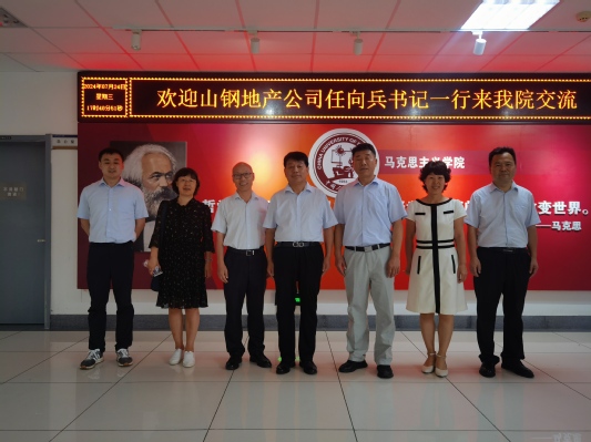 7月24日下午,山钢地产公司党委副书记任向兵一行来我院开展党建联建座谈会,我院党委书记司江伟、副书记兼副院长袁爱军、马克思主义基本原理概论教研室党支部书记薛俊清、团委书记王会参加了此次座谈会。