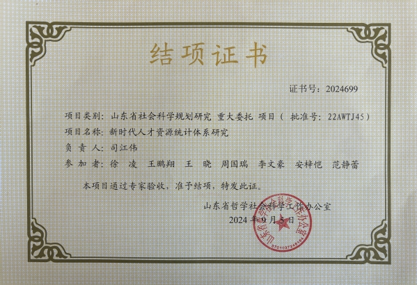 近日,由我院司江伟教授主持的山东省社会科学规划研究重大委托项目《新时代人才资源统计体系研究》(批准号22AWTJ45)顺利通过专家验收,并正式结项。根据党的二十大报告对新时代人才工作的部署,2022年11月,中共山东省委组织部确定了6项人才研究重大课题,以省社科规划重大委托项目的形式发包招标。经过严格的竞标、答辩等环节,我院司江伟教授及其团队获准承担《新时代人才资源统计体系研究》项目。