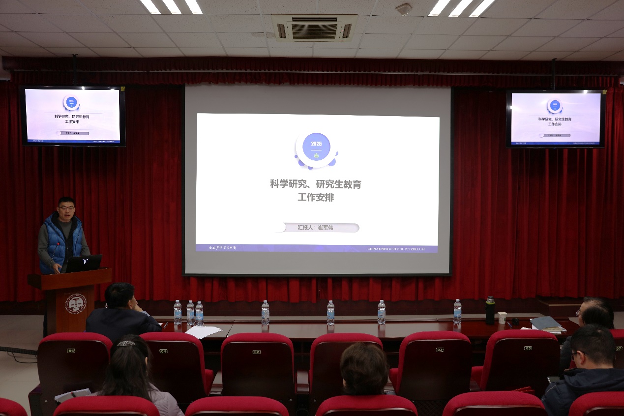 3 月 7 日上午,学院于文理楼 142 会议室召开全院教职工大会,学院领导班子成员、全体教职工参加会议。此次会议旨在学习贯彻学校新学期工作会议精神,全面总结2024年工作业绩,对 2025 年各项工作进行全面部署。学院党委书记司江伟主持会议,并传达了学校党委书记吴强明、校长郝芳在学校新学期工作会议上的讲话精神,学院院长张瑞涛作总体工作安排。