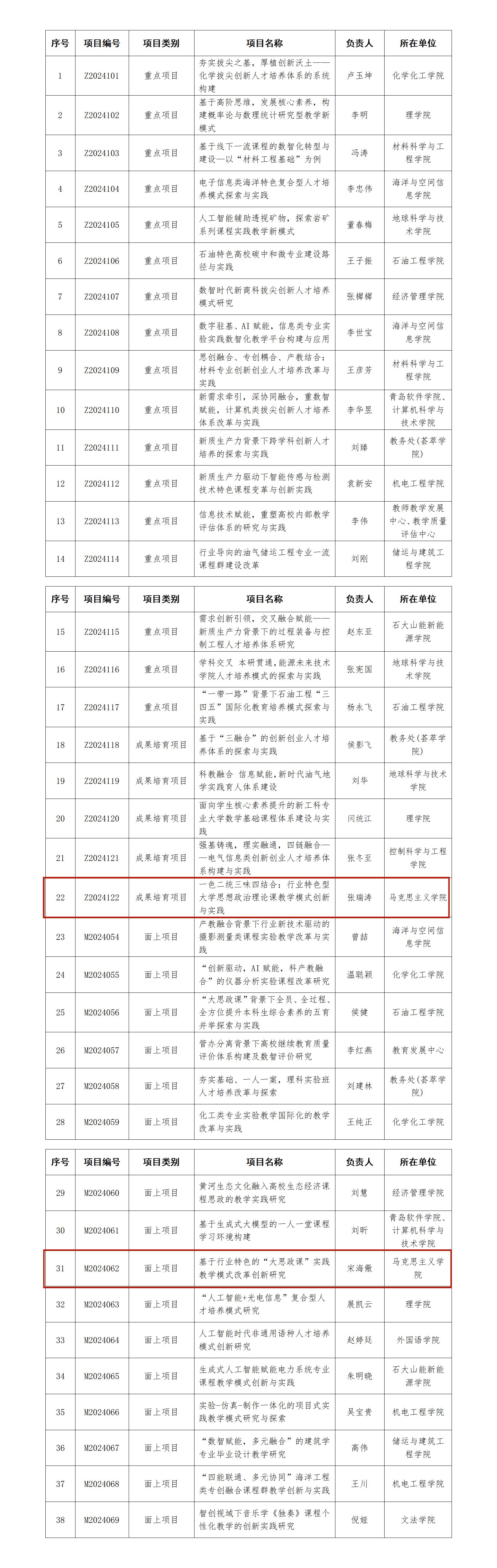 近日,山东省教育厅公布了 2024 年本科教学改革研究项目立项名单,我校共有38个项目成功获批立项,涵盖重点项目22项(其中成果培育项目5项)、面上项目16项。