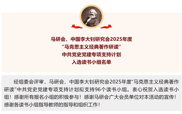 5月19日,中国高等教育学会马克思主义研究分会(以下简称“马研会”)、中国李大钊研究会发布2025年度“马克思主义经典著作研读”中共党史党建专项支持计划读书小组入选名单,我院申报的“星火研读社”读书小组成功入选。该计划旨在鼓励青年学子深入研读中共党史党建类经典书目,并结合中共党史和党建实践,开展系统性、深入性的学习和探讨。