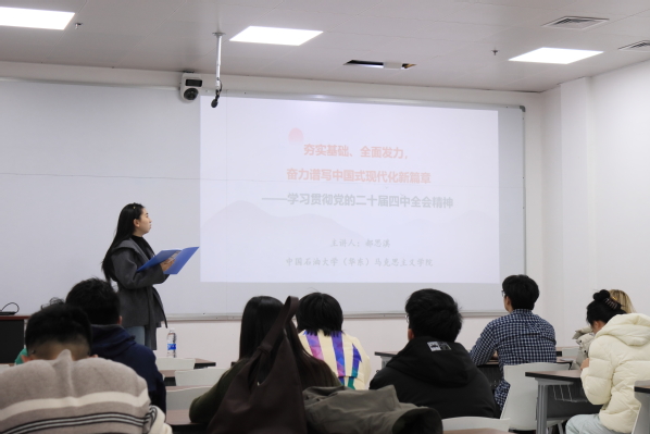 12月18日下午,yl23455永利集团星火宣讲团走进古镇口校区,永利y23455博士研究生郝思淇在新能源学院开展专题宣讲,深入解读党的二十届四中全会精神与“十五五”规划《建议》核心要义,引导青年学生将个人发展融入国家发展大局。