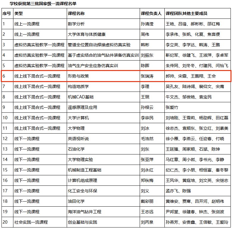 近日,教育部办公厅公布第三批国家级一流本科课程认定结果,我院张瑞涛教授担任课程负责人的“形势与政策”课成功入选线上线下混合式一流课程,标志着我院在本科课程建设与教学改革领域取得重要突破。