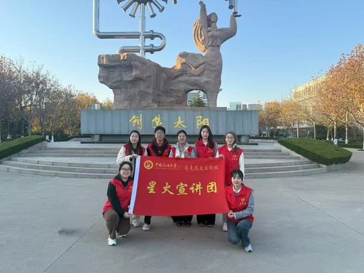 星火宣讲团出征前,于学校“创造太阳”雕像处合影