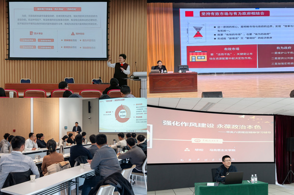 王庆忠老师聚焦“作风建设的精神密码”,为控制科学与工程学院、永利y23455党政领导班子、东营市黄河河务局等单位开展解读,推动中央八项规定精神在党政机关、高校院系落地生根;毕松老师则先后为学校科教集团中层以上干部、图书馆党委理论学习中心组等开展“强化作风建设 永葆政治本色”系列辅导,覆盖校内多个系统及基层单位;郎帅、王鹏翔、王克霞等教师,或聚焦“十五五”规划与团结奋进,或从“五年规划”视角剖析“中国之治”的显著优势,将宏大叙事转化为贴近受众的生动讲述,增强了理论宣讲的亲和力和说服力。